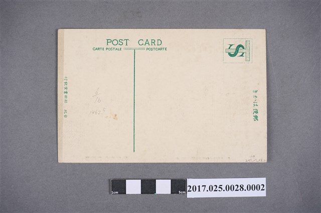 本文物為日治時期黑白印刷的明信片,圖中為臺灣總督官邸外觀,在下方並有註記「臺灣總督 官邸 FORMSA GOVERNMENT OFFICE(29) 」的字樣,右上角則有壹錢五厘的郵票,並蓋上「臺灣總督府始政第十五回紀念.43.6.17」的郵戳。而背面則有註明為「台北 杉田書堂發行」。 臺灣總督官邸建於明治34年(1901年),因其原木屋頂受白蟻侵蝕,於大正元年(1912年)大修,由森山松之助進行改建設計,屋架採用鋼骨,完工後為一後期文藝復興建築。而自第四任總督兒玉源太郎開始使用,直至最後一任總督回日,期間更接待過裕仁皇太子。戰後,曾作為省主席官邸,民國39年(1950年)改稱臺北賓館,由外交部管轄,為舉辦國宴、接待外賓之處所。