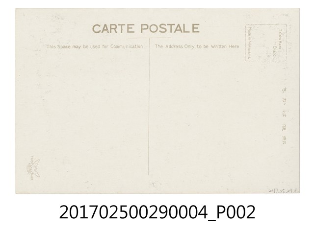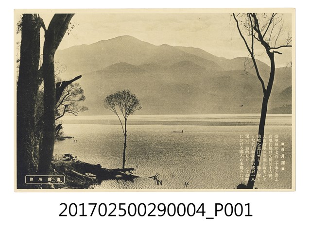 本文物為日治時期臺灣的印象明信片組之一,為黑白印刷,圖中為日月潭的景色,可見湖中有一小船,而湖周遭被山所圍繞,在右下角有日月潭的地理位置等介紹,左下角則寫有「臺灣所見」的字樣。背面貼郵票處,則寫有「Taisho Hato Brand,Made in Wakayama」的文字。 日月潭位南投縣魚池鄉,為臺灣中央山脈的中心地帶,海拔約750公尺,以潭中的拉魯島(舊稱光華島)為基準,島北為前潭,形狀渾圓,被稱為「日潭」,島以南,則呈彎月狀,被稱為「月潭」,合稱即為日月潭,為臺灣最大的湖泊。 日月潭一詞最早出現於清道光元年(1821年),為北路理蕃同知鄧傳安《游水裡記》中提及。而相傳邵族祖先,在狩獵一隻白鹿時,發現日月潭,覺得適合耕種漁獵,因而搬遷至此。但隨著漢人開墾的進入,瘟疫的發生,邵族人大量減少,漢人及平埔族的進入,使此區有多族群的特色。