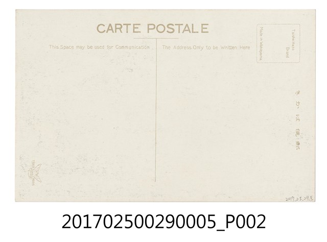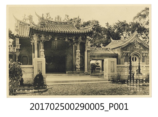 本文物為日治時期臺灣的印象明信片組之一,為黑白印刷,圖中為吳鳳廟外觀,在右下角有吳鳳廟的地理位置等介紹,左下角則寫有「臺灣所見」的字樣。背面貼郵票處,則寫有「Taisho Hato Brand,Made in Wakayama」的文字。 吳鳳廟位於嘉義縣中埔鄉社口村,約於嘉慶25年(1820年)由通事公廨改立祠,被俗稱阿里山忠王祠,但毀於明治39年(1906年)的地震中,在嘉義廳長津田說「輔助其祠宇管理人之議,醵資以新建其廟」,大正2年(1913年)捐資重建。其原為單開間單進式,在昭和6年(1931年)修建時,擴充拜殿、正殿、兩側廂房大小,又於民國74年(1985年)設立吳鳳紀念公園,並增建後殿及廂房。 吳鳳,生於康熙38年,其父親從事與原住民番割的交易,並成立「吳大振」墾號,吳鳳日後繼承父業,為墾首,一直至乾隆34年(1769年)被殺,目前對於其死因有幾說,一為捨身成仁,二為原住民誤殺,三為拒戰被殺,四為原住民討索吳鳳首級,五為吳鳳掩護他社被殺,在吳鳳死後,鄒族部落發生瘟疫,並與布農族衝突,種種因素使鄒族減少出草,此種行為受到日本殖民政府所利用於其統治。戰後,也受到蔣中正親頒「舍生取義」的匾額,加以讚揚。但在1980年代,原住民族為消除野蠻刻板印象及解構殖民統治,積極抗爭吳鳳神話,而吳鳳故事也就從教材中取出,吳鳳鄉也改名為阿里山鄉等。