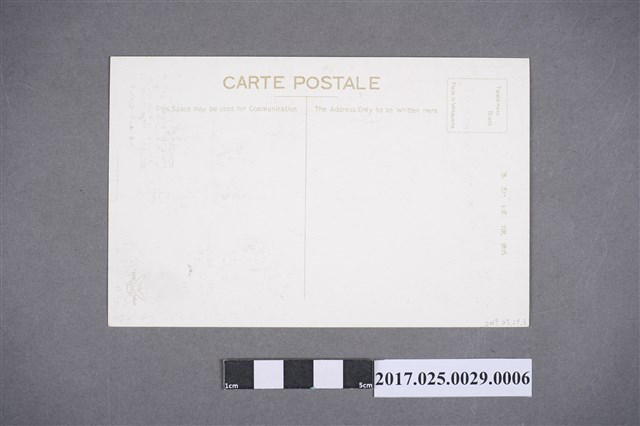 本文物為日治時期臺灣的印象明信片組之一,為黑白印刷,圖中為北回歸線紀念碑,並有一人站在樹下眺望,在其右上角除介紹其地理位置,也介紹了北回歸線的意思,而左下角則有「臺灣所見」的字樣。背面貼郵票處,則寫有「Taisho Hato Brand,Made in Wakayama」的文字。 北回歸線紀念碑位於今嘉義縣水上鄉下寮村,為世界上第一座設置回歸線標誌物,興建於明治41年(1908年),為慶祝在臺縱貫鐵路的全線通車而設立。曾因風災損壞,在大正10年(1921年)時重建第二代,大正12年(1923年)裕仁太子巡臺,指示改為將木頭材質改為泥石塔,此為第三代,後於昭和9~11年間(1934~1936年間)改變其上部造型,到了昭和17年(1942年)建第五代,由千千岩助太郎設計,並將字由北回歸線標改為北回歸線標誌,而第六代標誌則於民國84年(1995年)完成,民國94年更設立北回歸線太陽館。 北回歸線為太陽直射最北端的緯線,大約為北緯23.5°,而北回歸線也受天文等影響,位置有些許變動。臺灣除了嘉義縣水上鄉興建北回歸線紀念碑外,在花蓮縣瑞穗鄉、豐濱鄉也都有北回歸線標誌的設立。