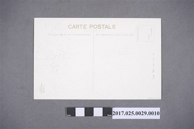 本文物為「臺灣所見」黑白明信片套組中之一件。可見兩位乘客搭坐在臺車上,由另一人步行且以手壓桿使臺車前進,明信片正面右上角並有對臺車之解釋。明信片背面郵戳處的「MADE IN WAKAYAMA」字樣可知此套明信片是在日本和歌山所製。 臺車多被建於日治時期的日本殖民地,如臺灣、朝鮮,因其軌道興建速度快,構造簡單,以輪子、木板、竹竿即可搭成承載平臺,可載貨亦可載客,故在1920年代公路尚未發展前較為盛行,而後逐漸被公路運輸取代。