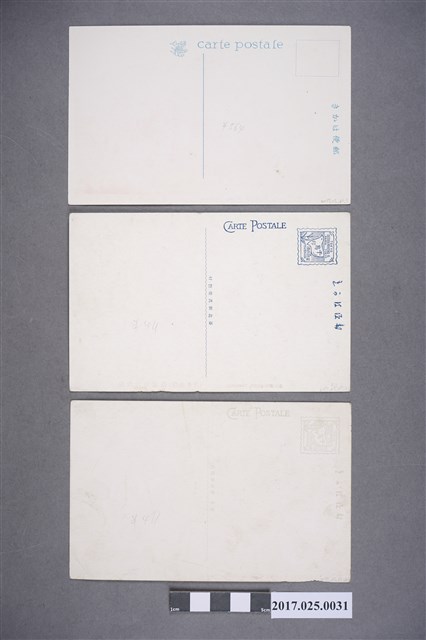 本文物為昭和時期「臺北街景」彩色手繪明信片套組,共計三枚。依序為臺灣軍司令部明信片、臺北三線道路明信片、臺北植物園的椰仔樹林。唯臺北三線道路明信片較其它兩張不同,明信片背面郵戳處印有「千鳥印登錄商標及KANDA TOKYO」等字樣且中間空白橫線處印有「臺北新高堂發行」等字樣,可得知是由日本神田設計,臺北發行。