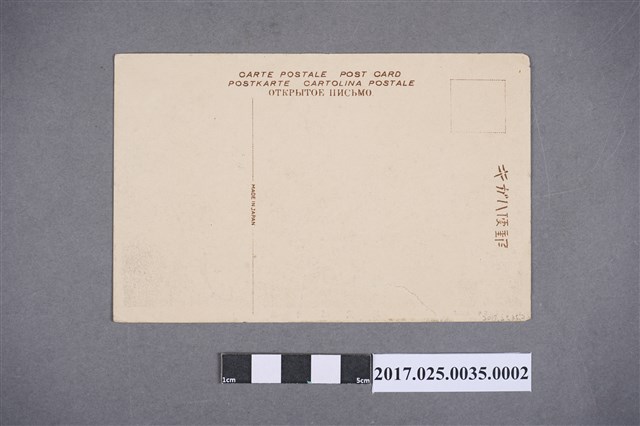 本文物為大正時期「新竹風景」黑白明信片套組之一,墨色印刷。底下印有新竹郵便局及(臺灣新竹 犬塚商店發行)等字樣。日本治臺初期即在新竹設立郵便局,一開始僅用家屋簡單修改而成,一段時間後已殘破不堪使用。於是在1913年在當時新竹廳對面動工興建新郵便局建築,於1914年中落成。
