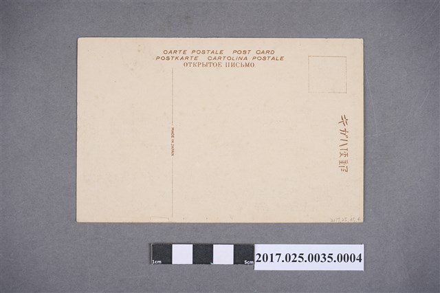本文物為大正時期「新竹風景」黑白明信片套組之一,墨色印刷。底下印有新竹市場及(臺灣新竹 犬塚商店發行)等字樣。新竹市場分為中央、東門、南門、西門、北門市場。