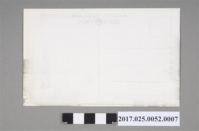 本文物為「臺南名所」黑白明信片套組之明信片,「臺南名所」為昭和時期印刷出品之黑白明信片套組,內含的十六張明信片上印有臺南十六處著名的地方影像。本文物為日治時期臺南神社之黑白明信片,影像中可見拜殿前共有兩座鳥居,兩旁豎立著石燈籠,在第一座鳥居旁有題著「官幣中社臺南神社」字樣的立碑,由參道上的小孩與大人的比例可以看出,拜殿、鳥居、石燈籠皆高大。臺南神社建於1900年,是臺灣第一座神社,主祀因染瘧疾而在臺灣逝世的北白川宮能久親王,其社格為官幣中社,僅次於被列為官幣大社的臺灣神社。官幣社為日本神道中僅次於神宮的社格,由官方分派的神衹官負責祭祀。明信片背面印有法語「UNION POSTALE UNIVERSELLE」(萬國郵政聯盟)之字樣,也以英文「POST CARD」、日文「葉書」標示出其明信片之字樣。