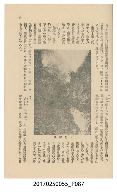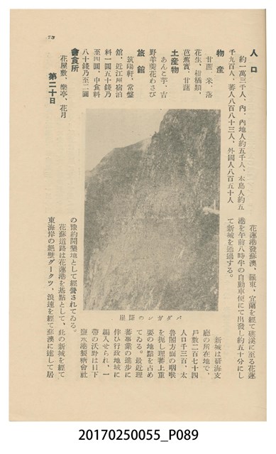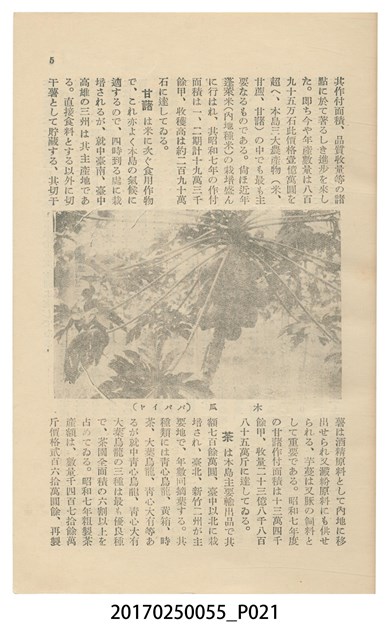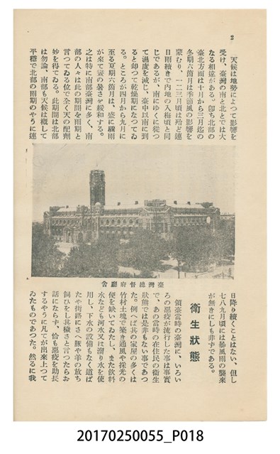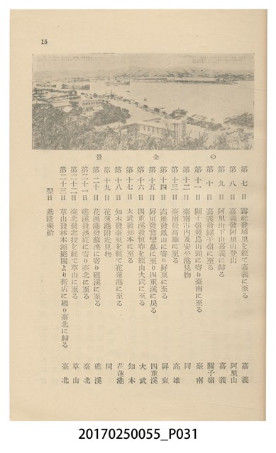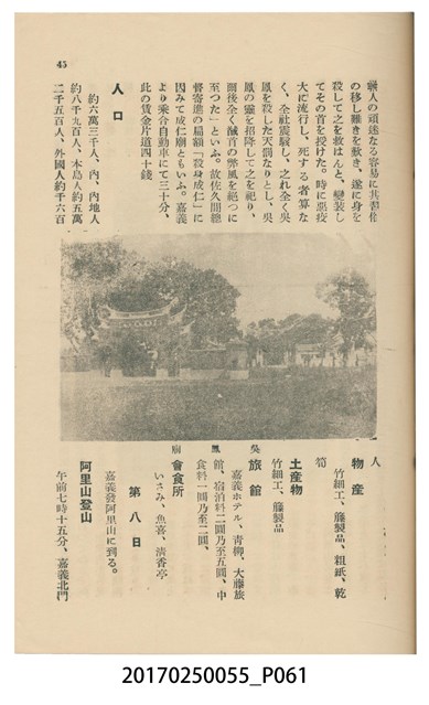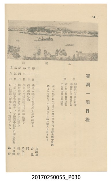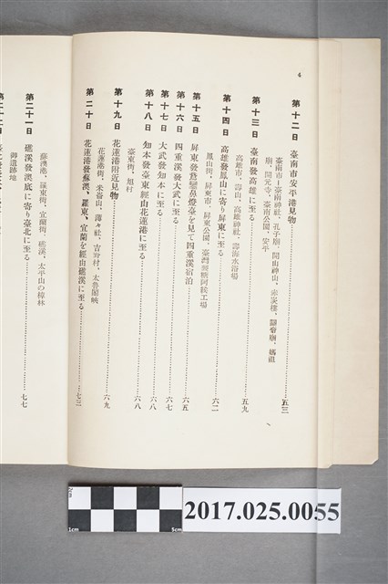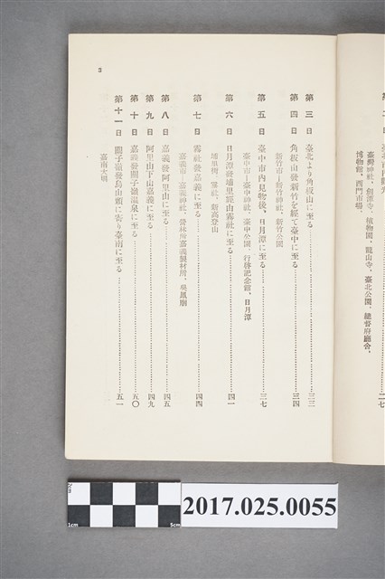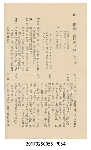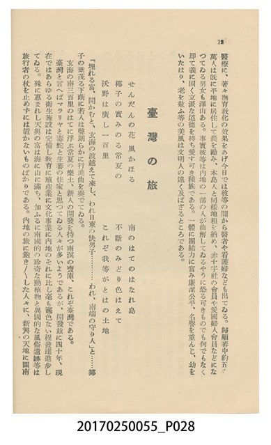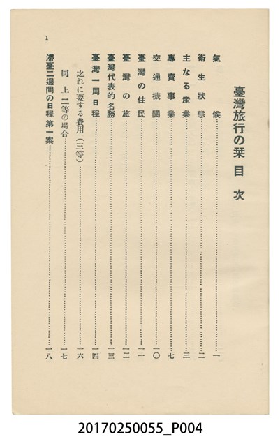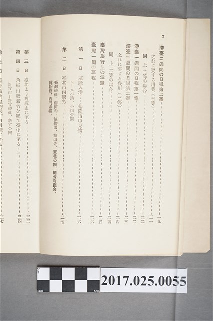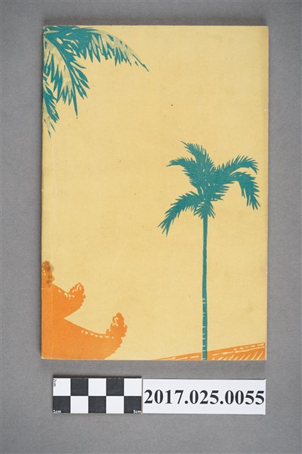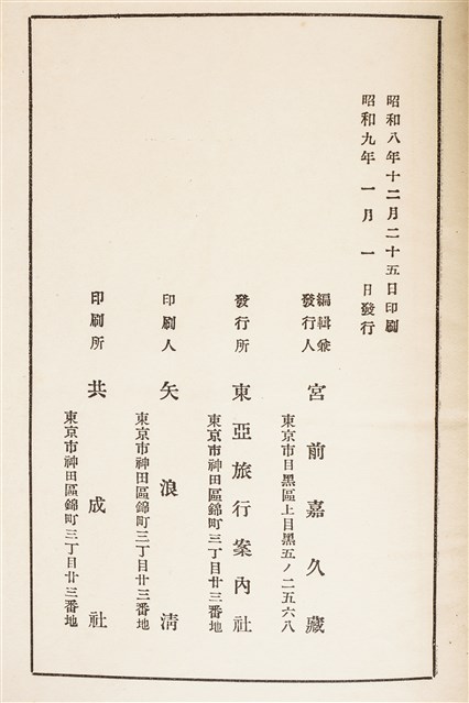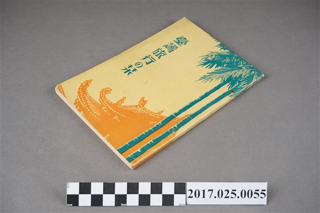 1.《臺灣旅行刊》為日治時期日本發行介紹臺灣旅遊之書籍,編輯兼發行人為宮前嘉久藏,1933(昭和8)年12月25日由共成社印刷,1934(昭和9)年1月1日由東亞旅行案內社發行。書籍封皮為淺黃色底,封面印有椰子樹、廟宇樣及「臺灣旅行の栞」字樣,封底及封面圖案有連貫性,書中空白頁以毛筆寫有「臺灣旅行の栞」。
