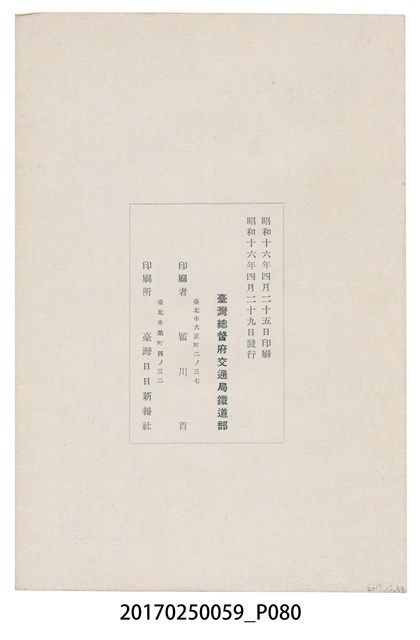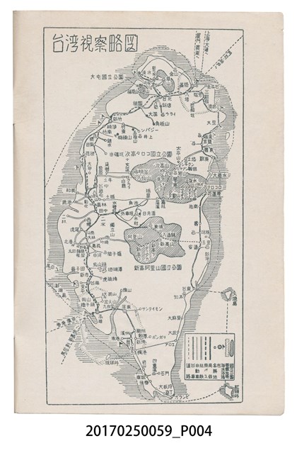 本物件為昭和十六年由臺灣日日新報社印刷,臺灣總督府交通局鐵道部發行。封面為藍底,印有「台湾の旅」及鐵路形狀圖案。封底右下印有「鉄道部」及鐵路圖案,與封面之圖案連貫。書籍前言說明該書忠實呈現實察地狀況,書中所提及旅館名稱為日本旅行協會所指定。其美中不足的地方在於部分記事稍嫌簡陋,望讀者指教。目次則有台灣各地景點,附有「台灣視察略圖」及「基隆竹南間線路略圖」及各景點路線圖。 臺灣日日新報為1898年日人守屋善兵衛併購《臺灣新報》與《臺灣日報》而成,日日新報帶有官方色彩