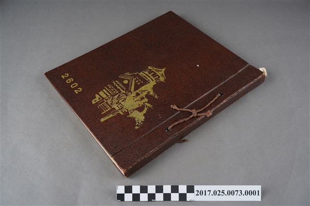 本文物為昭和十七年私立淡江中學校之畢業紀念冊。紀念冊封面印有八角樓側寫照及「2602」的字樣,冊子右方以繩索固定。紀念冊前幾頁為學校平面圖、八角樓、校史等介紹。 冊子中的照片多樣,包含校園景色、運動會、升旗典禮、學校社團(日本射箭、劍道等)、神社參拜及配合戰時體制下的「勤行報國隊」、軍訓課、慶祝大東亞戰爭捷報等照片。勤行報國隊為日治時期為訓練台灣青年而成立的教育及訓練機構,其精神在訓練台灣青年體力,及培養皇民精神。