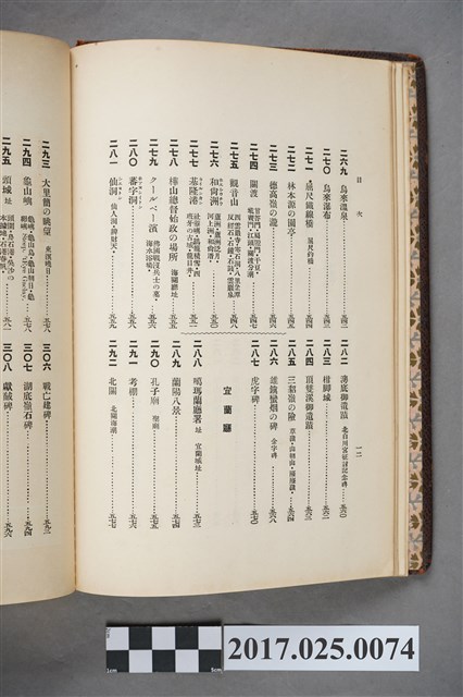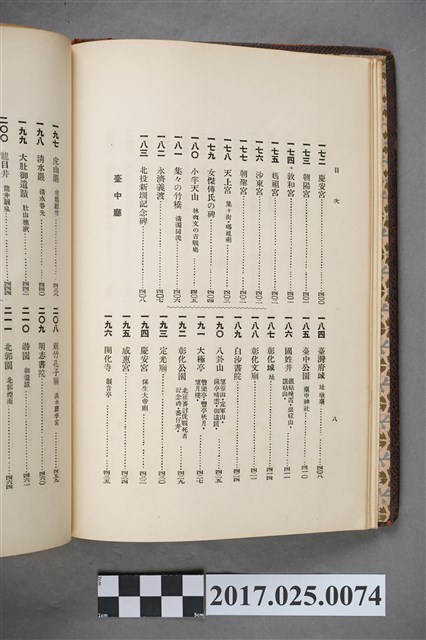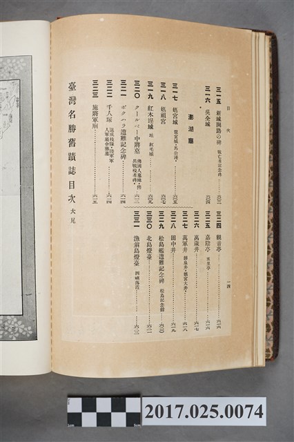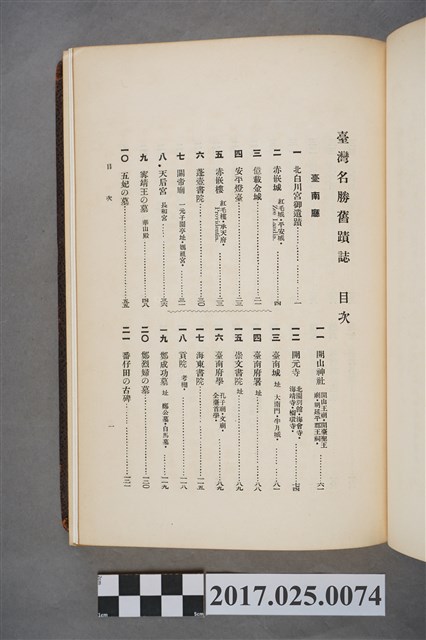 本書紀錄當時行政區域,如臺南廳、阿猴廳、嘉義廳、南投廳、臺中廳、新竹廳、桃園廳、臺北廳、宜蘭廳、台東廳、花蓮港廳、澎湖廳,境內之名勝古蹟,並以文字解說搭配每個景點照片。