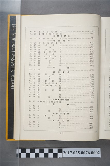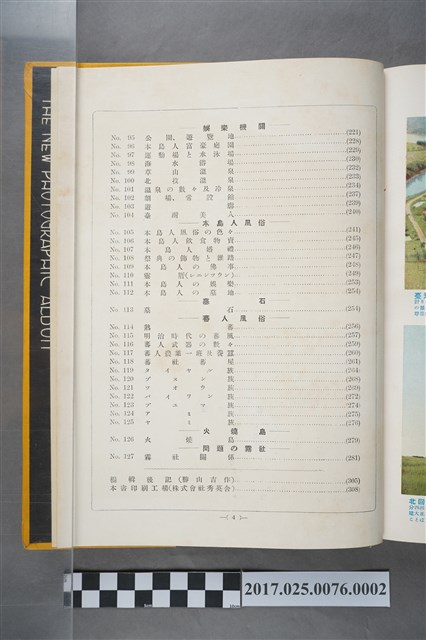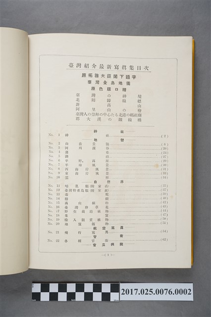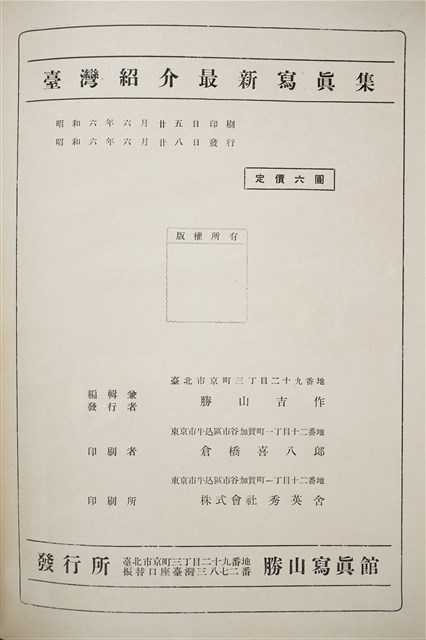 本文物為昭和六年由株式會社秀英舍印刷,勝山寫真館發行之臺灣介紹最新寫真集。書本封面由上至下印有「台湾紹介最新寫真集」、「AGUIDE TO FORMOSA」、「勝山寫真館發行」。本書目次分為神社、地勢、航空寫真、教育機構、宗教、史蹟明勝、蕃人、霧社事件、火燒島等25項。除各項分類介紹的黑白照外,亦有幾張彩色照,如北回歸線標、新高山等。書籍末幾頁有廣告、多田北烏先生給編者的信及編輯後記。
