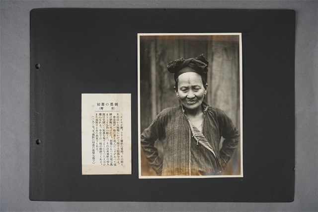 本文物收錄於昭和二年,亞細亞大觀第四十二回臺灣篇中。為泰雅族婦女紋面照。照片中人物為一名泰雅女性,其額頭及兩側臉頰皆有紋面,相片周圍因年代久遠,而出現白影。說明紙的內容大致如下,「泰雅族烏來番社老婦,其額頭,嘴巴兩頰皆有紋面。從前年輕的女子無故死去,經神祉囑託,在臉上刺上紋路及可躲過……現今成為一種象徵成熟的裝飾」,拍攝於1927年5月,照片禁止複製。 紋面對於泰雅族群意義重大,其不僅象徵辟邪、成熟、表彰英勇,更重要的是與祖靈間的聯繫。