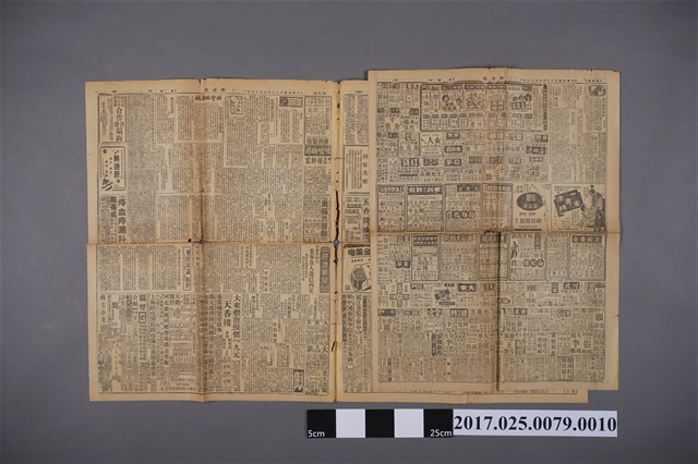 本文物為民國32年6月16日之《新聞報》。報紙名稱下方有本報資訊,如本報為第一萬七千九百三十一號、本報共一張半、售價七角、報社位於上海漢口路274號等。報紙周圍有些許缺角,中央有破洞。報紙內容有廣告訊息,如藥品、商品廣告,及各式啟示文、銀行開業文、慈善獎券、學校招生等,外國新聞及影視娛樂新聞自成一篇。外國新聞以二戰歐陸戰況占多數。本報設有「經濟新聞」區。