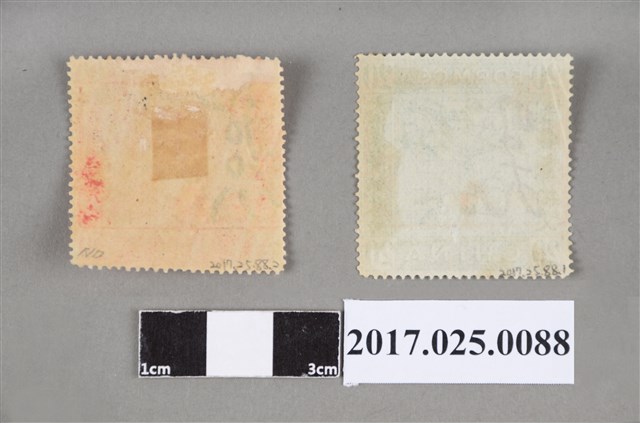 物件有兩樣,皆為光緒年間由大清臺灣郵政局所發行之龍馬郵票,郵票顏色為紅、綠兩種,上方皆有毛筆寫過痕跡及紅色印章。兩件文物保存狀況良好。