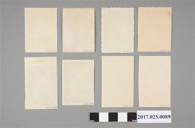 文物共8件,為民國40年由中華民國郵政局發行之紀念郵票。本款郵票為紀念臺灣省實行地方自治,面額有4角、1圓、1圓6角、2圓,四款郵票圖案皆為農民、稻穗、投票箱。上排郵票為鋸齒狀四邊,下排則為平整的四邊。