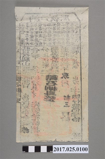 此文物外觀完整,為道光18年發給之繳稅收據,上方蓋有2個完整的戳章,及只蓋半個的戳章,3個的字樣都已很難辨認,執照的最上方寫著「正堂曹 論該 業戶知悉串內 完數字號年分 月日尔等務於 領串時逐一查 看如有填寫舛 錯以及糢糊不 明添改挖補等 情許及日內粘 呈赴縣以憑查 明換給母得隱 匿自貼後累凜 之慎之特諭」。
