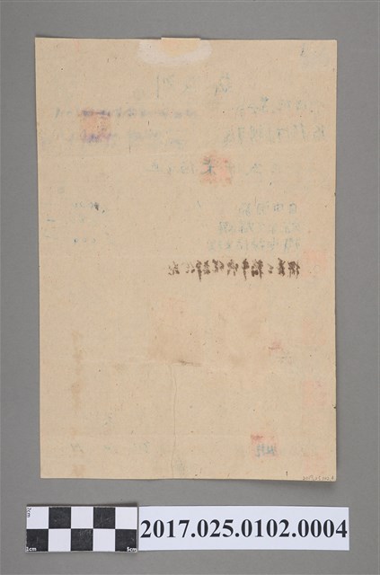 本文物為民國37年10月11日,中國鹽業公司烏樹林辦事處向劉福摩托車工廠購買零件之收據單,內容物有自由關節、螺絲及螺絲頭,和機關換活塞環個一個,總計金額為3700元。另外貼有三張中華民國印花稅票,一元計有二張,十元一張,上印有國父像。 日治時期台灣地區的鹽業由專買局管理。1945年二戰後,政府則將全部鹽田接收並成立台南鹽業公司。1946年為統一鹽政,成立了台灣鹽務管理局,1947年財政部成立中國鹽業公司,才將台灣鹽業交由中國鹽業公司臺灣分公司經營