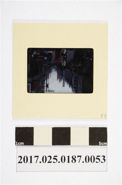 此文物為彩色照片,畫面呈現一街道,兩旁店家林立且都掛滿大大小小的招牌,路旁有幾根路燈及電線杆,靠近拍攝者的前方有位穿著紅衣的婦人騎著機車正看著鏡頭,旁邊也有一些機車及行人,遠一點可以看到右邊路邊有賣水果的攤販,再遠一點的路旁有停著一輛貨車,路上也有行駛中的車輛及行走中的行人。