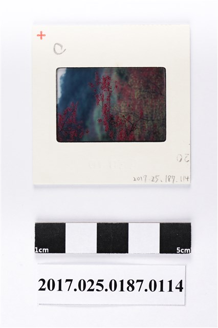 本文物屬戰後時期之彩色正片,以膠框包覆四周。左上角以黑筆寫有「20」,正上方有「FEB80」的刻痕。正片內容為一株開著粉紅色花朵的植物,背景由遠至近為天空、樹林、較矮的植物。底片可大致分成正片及負片兩種,其中又可分為黑白及彩色。彩色正片,俗稱幻燈片,在正常之沖洗下,底片會直接呈現拍攝時的色彩。