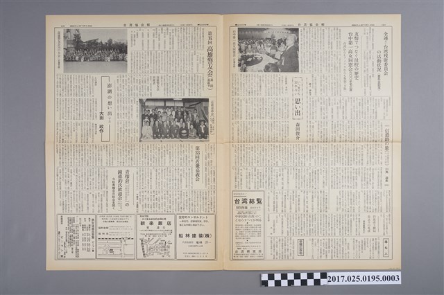 本文物為財團法人台灣協會《臺灣協會報》昭和54年(1979年)7月15日第1、2、3、4版,內容記錄二戰後臺灣與日本之間因曾為殖民地關係,而產生之交流,第1版報導二戰後持續進行之台鐵會、第七回屏東大會等新聞。第2、3版內容多為各校同學會、緬懷臺灣等兩地記憶連結的文章。第4版則是會費收取的紀錄,以及戰前在臺就學之日人同學會之文。