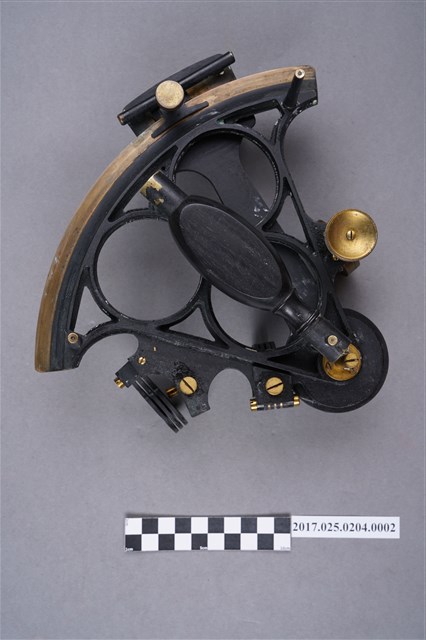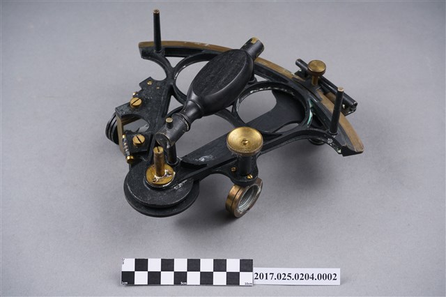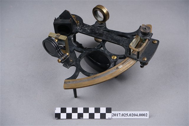 本文物為六分儀,包括儀架、釋放桿、分離鼓、指標桿、水平色鏡、水平鏡、指標色鏡等構造。