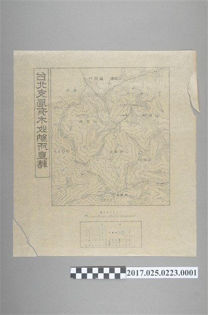 本文物為〈5萬分之1臺北支局有木收納所直轄〉,繪製時間與出版時間不明。地圖以等高線測繪,並加入行政區、交通路線、街庄名稱等資訊。附有凡例一則於地圖下方。