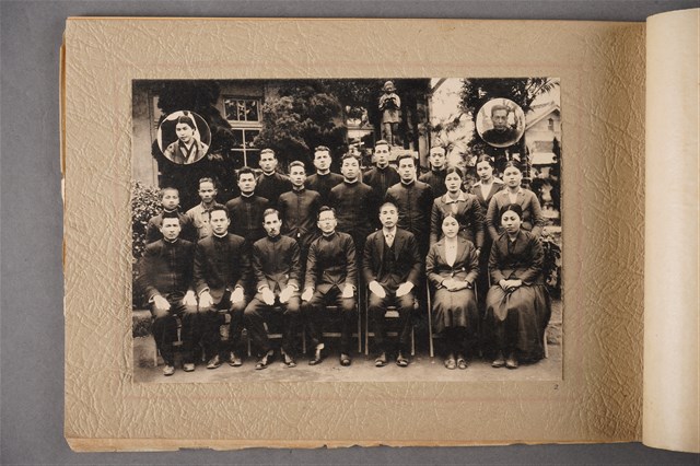 此物件為卒業紀念帖內頁之一, 是一張20人的合照(另有2人大頭照),右後方有二宮尊德之銅像,判斷此應為學校單位,從其服裝及年紀來看,這應為中等學校畢業合照。 台灣攝影技術的普遍,大約可推回日治時代,當時市街上已有「寫真館」(即照相館)的出現,日本政府或為調查,或為宣傳觀光,在台灣拍下許多照片,而攝影在日治時期屬於奢侈品,對於普通百姓是相當昂貴的,在當時只會在重要的時候拍照,如結婚、畢業照等重要的紀念日,這些畢業照片到如今都成為珍貴的史料,可透過這些照片知道當時學生的穿著、活動及學校、附近生活區的樣貌。二宮尊德1787年出生,又名二宮金次郎,其十餘歲時遭逢父母過世,需含辛茹苦照顧幼弟,負擔家計之餘,又不忘認真念書,終而再興家業,其認真苦讀的樣貌,被塑造為銅像,放於學校單位之中,以使學生效法。