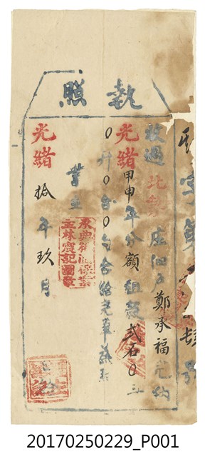 此物件為開墾執照,租佃戶為北勢的鄭承福,光緒甲申年需繳貳石予以業主,從圖章來看,業主為林宸記,此執照時間為光緒10年9月。