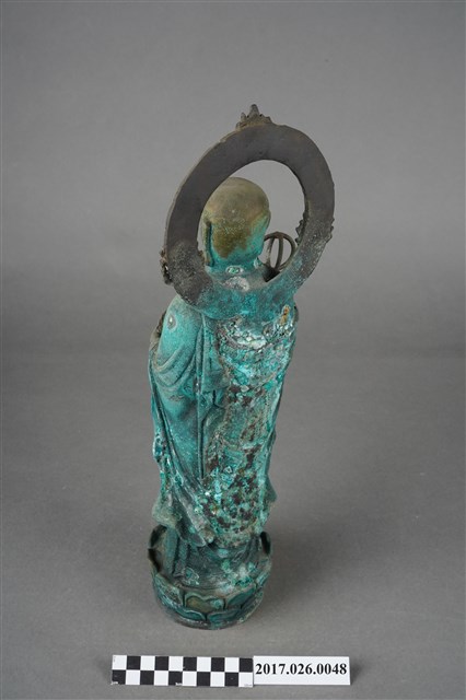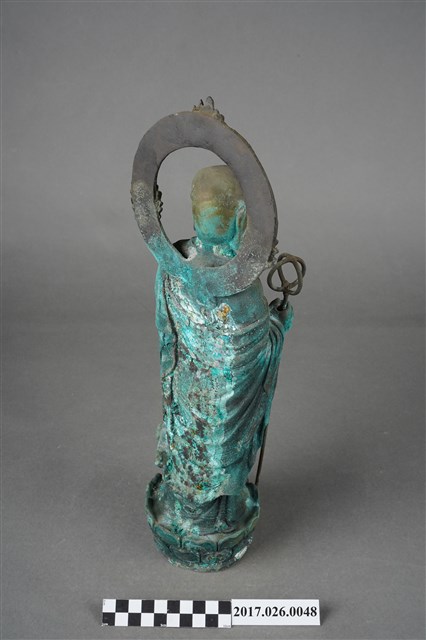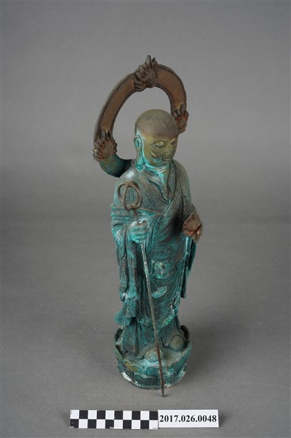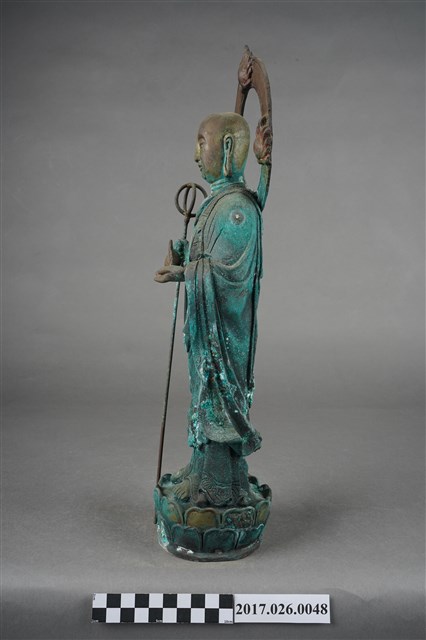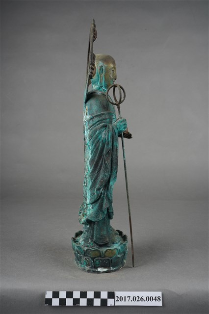此為銅製地藏王菩薩神像,神像完整,紋路清晰,但銅鍍金部分大致消失。地藏王菩薩本為東嶽神,統帥十殿閻王與眾小鬼,相傳農曆七月的最後一天,是地藏王的得道日,民眾會在這一天舉行祭祀或法會。