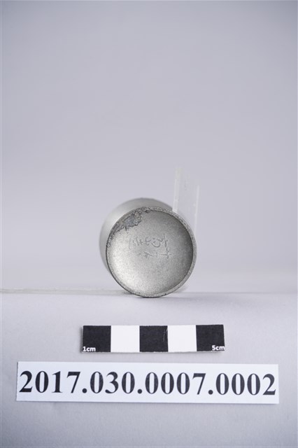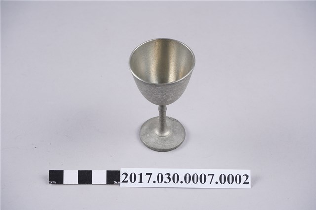本件為捐贈者林吳玉蘭的公公林玉輝先生(1895-?,新竹關西客家人)日治時期所收藏的錫製酒杯,杯身呈倒圓錐狀,深約5公分,圓形侈口,杯下帶3-4公分細高足,足底扁圓。酒杯外側裝飾櫻花花紋,杯底有「サツマ 高山造」字樣。