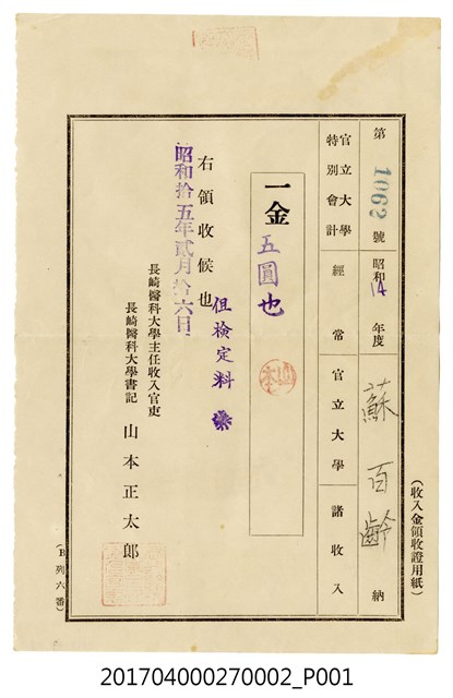 長崎醫科大學發放給蘇百齡的5圓收據,註明檢定費(檢定料)。收據為長崎醫科大學主任收入官吏長崎醫科大學書記山本正太郎。編號是第1062號,昭和14年度。類別是官立大學特別會計經常官立大學諸收入。