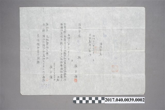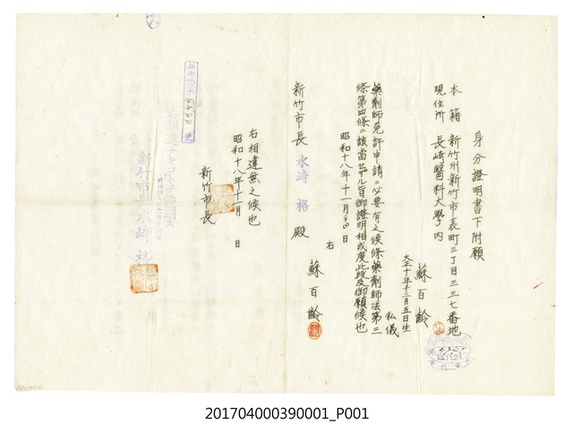 蘇百齡1921年生,新竹人。父蘇謙吉為什貨商,母蘇林氏足。四男,1928年就讀新竹公學校,1934年就讀新竹中學校,1940年就讀長崎醫科大學附屬藥學專門部,1942年畢業後就讀長崎醫科大學,1945年長崎遭受原子彈轟炸身亡。此為106034-0025「長崎縣內政部衛生課給蘇百齡通知申請藥劑師證書需身分證明書補件通知」要求需補上身分證明書,因此蘇百齡向新竹市長提出申請。要求新竹市長開立因為申請藥劑師證書所需,請市長證明其並無該當藥劑師法第3、4條之情事。後有蘇百齡之用印。並有出生日期,本籍新竹州新竹市表町