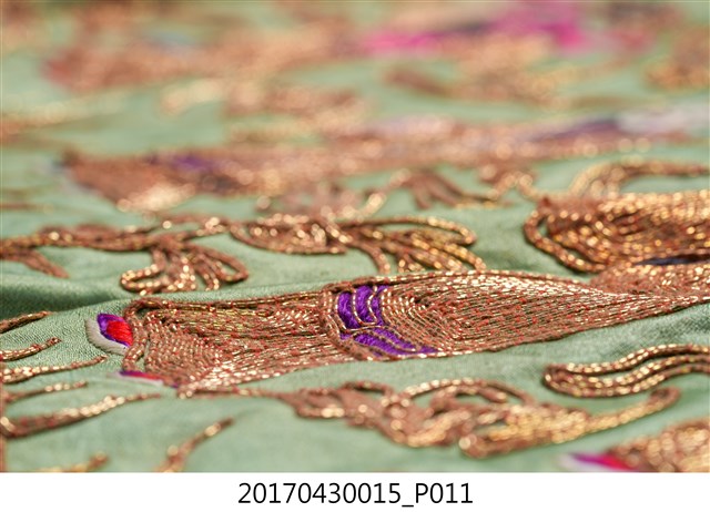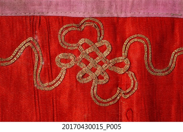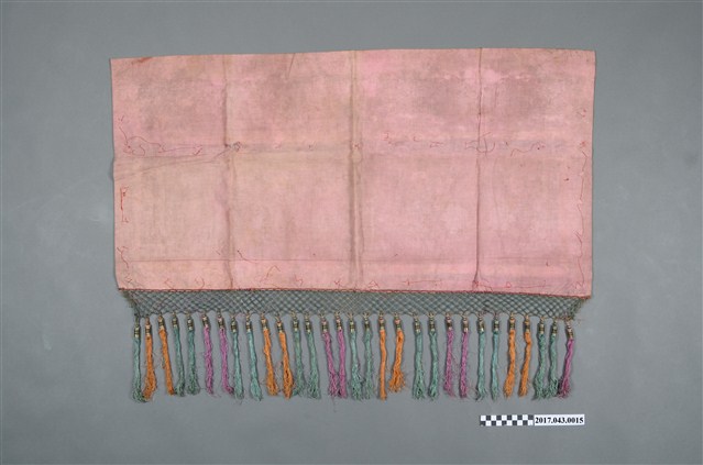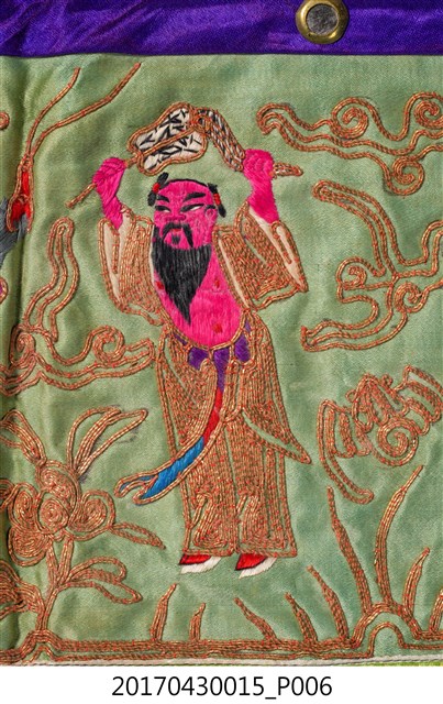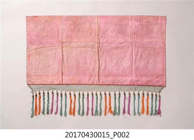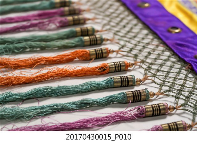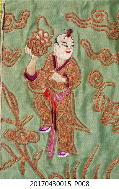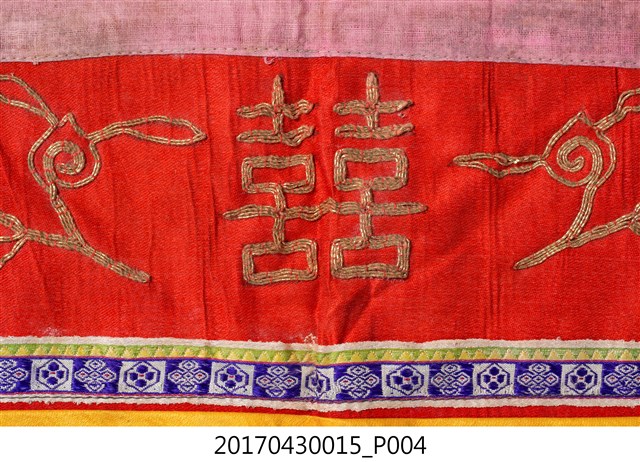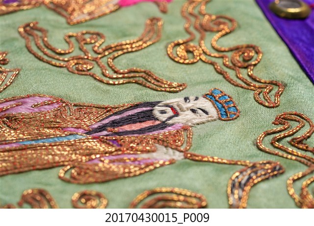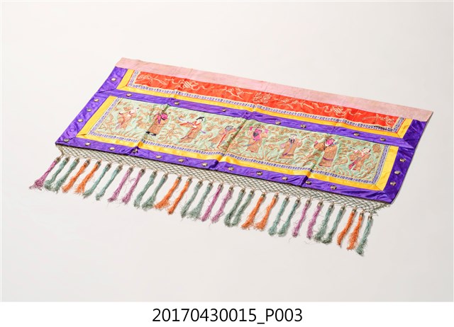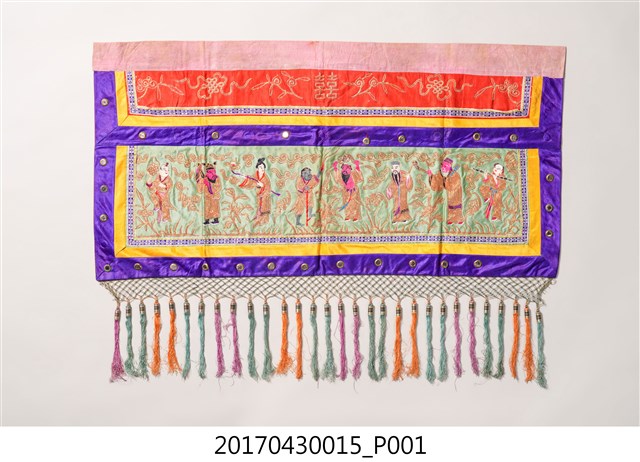 1. 張捷繡製囍字八仙綵,是畫家陳澄波1918年與其妻張捷結婚時,張捷親手刺繡的嫁娶用品。八仙綵外型呈長方形布面,正面以藏藍色、粉紅色為底布,上搭配黃、紅兩色作底布的上層刺繡面,及黃、綠兩色底布的下層刺繡面,背面則為粉紅色素面底布,下緣接合綠網格與藍綠、橘、淺紫三色的流蘇綴飾。刺繡圖案上,上層主要繡暗八寶紋,正中央繡有囍字;下層刺繡八仙與蝙蝠、花草、卷雲等吉祥圖案,整體主要使用的技法為盤金繡,搭配緞面彩繡製成。2. 八仙綵是一種長矩形的彩繡圍幔,普遍可見於懸掛在民宅或廟宇的大門上,在婚禮、拜神、生辰、新居落成等喜慶場合更是經常出現。如其名稱,八仙綵的刺繡主題主要為八仙,除了八仙是受到民間歡迎的神祇外,「八」有「發」的諧音,及「綵」也具有好彩頭的意思。此外,有些八仙綵也添加福祿壽、麻姑或吉祥花卉圖案,讓整體繡品更添祝福意涵。
