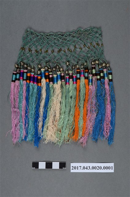 流蘇墜飾,大小約12x19公分,雙層流蘇,呈環狀,共26縷,主要的結構可分成2大部分,上半部為綠色彩線編結而成的線網,下半部為各色流蘇。線網編成古錢紋狀,網中間串有亮面小珠裝飾,將網飾分成兩段。線網底端串接圓珠與流蘇,流蘇有藍、水藍、紫、橘、綠、米白等顏色。流蘇頂端橫向緊密纏繞藍、黑、桃粉、綠、橘等色線固定流蘇垂墜彩線,各色彩線彼此互相襯托,增加變化。