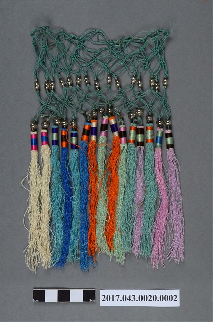 流蘇墜飾,大小約14x17公分,雙層流蘇,呈環狀,共15縷,主要的結構可分成2大部分,上半部為綠色彩線編結而成的線網,下半部為各色流蘇。線網編成古錢紋狀,網中間串有亮面小珠裝飾,將網飾分成兩段。線網底端串接圓珠與流蘇,流蘇有藍、水藍、紫、橘、綠、米白等顏色。流蘇頂端橫向緊密纏繞藍、黑、桃粉、綠、橘等色線固定流蘇垂墜彩線,各色彩線彼此互相襯托,增加變化。