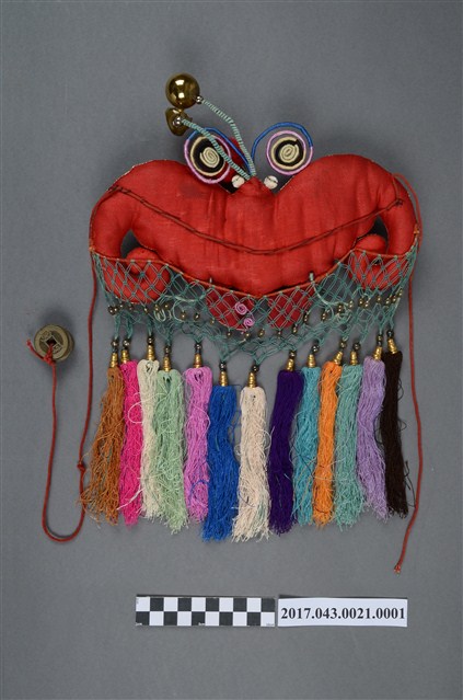 蝙蝠形彩墜,寬幅約33公分,蝙蝠造型,正面以米色拼接藍色、紫紅色、黃色、綠色等顏色的絲緞為底布,上以平針、圈金、搶針等技法彩繡裝飾;背面以紅色襯底,兩布中間塞入棉花,使墜飾膨起呈半立體狀。蝙蝠上方飾紅色絨球,頂端飾有金色圓球裝飾,其中一圓球破裂遺失。蝙蝠形繡片下緣縫垂綠色菱形網格綴飾,網格下配有黑、紫、綠、橘、水藍、深紫等各色流蘇。彩墜附有紅色綁線,綁線一邊尾端綁縫古錢。