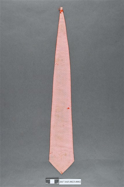 水藍色絲緞吉祥寶物紋劍帶,呈狹長條狀,上窄下寬,底端作三角銳角形。表布為水藍色絲緞,背面為淺粉色絲緞,兩面布料使用卷邊針法以紅線夾金線縫合,頂端與背面都留有縫合之線頭,水藍色絲緞面底端並貼縫黑色絲緞。在裝飾方面,兩面絲緞皆有緹花紋裝飾,水藍色絲緞面飾竹石紋,粉色絲緞面則有菱形網格與小碎花暗花為飾。此外,表布也使用緞面繡、長短針繡、輪廓繡等技法彩繡如意雲紋與吉祥寶物紋,彩繡底部以盤金繡繡出回紋飾帶。兩面底布部分可見點狀及片狀污漬。