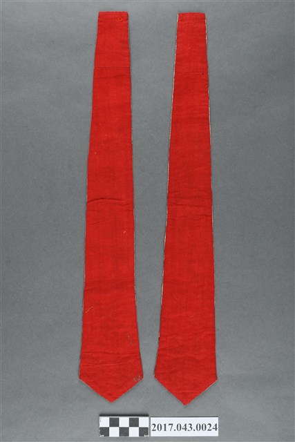 1. 白絲緞花鳥福祿吉祥紋劍帶組,共1組2件,包含1件米白絲緞人物花鳥紋劍帶及1件銀灰絲緞彩鳳福祿吉祥紋劍帶,兩者尺寸幾乎相同,裝飾的方式也很接近,如邊緣皆裝飾相同的飾帶,與底端三角形尖端皆繡有漸層藍色波紋裝飾,及背面同樣以紅色棉布襯底等。此外,兩件劍帶表布上彩繡佈排的方式亦相同,皆集中於劍帶下半部約三分之二處,以如意雲紋為起始,至下圖案主題也同以人物紋及鳳鳥紋飾為主。由諸多相似形制特色可見,兩劍帶可視為成對的一組,共1組2件。2. 劍帶因其造型狹長似劍而得名,是一種平面織品裝飾物。劍帶的形狀上窄下寬、底端呈銳角三角形,可見裝飾在居室用品上,如床緣、帳簾,或裝飾在服飾,如雲肩、上衫或下裙之上。劍帶表面通常都會有刺繡圖案裝飾,常見的圖案有花鳥、白鶴、瓶花、蝴蝶、八仙、龍鳳、詩句對聯等等,大部分帶有吉祥祈福的意涵。