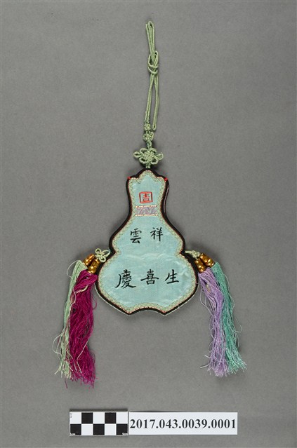 葫蘆形繡花菸絲袋,以靛藍色底布及湖水綠底布搭配刺繡、流蘇、吉祥結掛飾,袋面邊緣配有黑色、綠色滾邊,並以金線、紅線加以點綴。菸絲袋頂部縫製綠色吉祥結繫帶,可讓袋子掛墜於腰間或旱煙管上;兩側縫綴吉祥結飾,吉祥結下接湖水綠、淺紫、酒紅、草綠色四色流蘇。藍底布面以鋪面繡、套針繡等技法繡出童子抱蓮瓶及雁鴨、松樹圖案,具有富貴、長壽等意涵。菸絲袋另一面為湖水綠緞面底布,頂部以紅線繡帶方框的「吉」字,頸部繡一段蕉葉紋飾,葫蘆身則以黑線繡「祥雲生喜慶」之字樣。