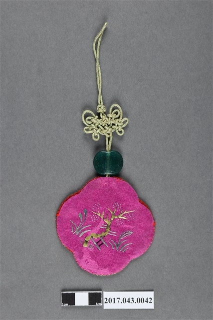 1. 米白絲緞花形繡蝴蝶紋掛飾,為穿戴在身上的裝飾物。掛飾主要由三個結構組成,上方為綠色吉祥結飾,結飾下穿有一綠色半透明扁圓珠,下方則為刺繡裝飾品。繡品形狀呈四瓣花形,正面中央鏤空作圓形孔洞裝飾,背面則未穿圓孔。繡品有兩面,正面以米白絲緞為底布,背面以桃紅色緹花絲緞為底布,正背兩面皆有刺繡圖案,正面彩繡四隻朝向中央展翅的蝴蝶圖案,背面中央則刺繡花草樹木。2. 臺灣早期漢人的裝束繼承了清代,無論男女皆會隨身繫掛配飾。女性通常是在衣襟上懸掛耳挖、香鏟、香囊、鑷子等小配飾;男性則在腰帶上掛荷包、扇套、眼鏡袋、筆墨袋、掛錶、扳指籠等等,種類多元,稱作「腰間雜佩」。男子腰間配戴雜佩源於隨身攜帶日常用品的需求,不過後來則以裝飾功能為主,特別是在清代十分興盛,常作為宮廷賞賜或官場送禮拜門之物,而一般民眾則是將之作為年節喜慶餽贈的禮物。