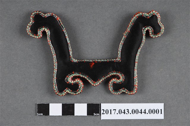 如意雲形繡片,長約10.9公分,寬約6.9公分,是用於縫製衣物服裝或居室佈置等繡品的組件。繡片形狀似方鼎,兩側出枝外擴,至頂端外伸作卷雲形,下半部則向內,作內卷的如意卷雲形狀。繡片布料有兩面,皆使用黑色底布,布面以盤金繡及綠色和米色組成的編織飾帶沿著邊緣縫繡裝飾一周,背面中央仍保有繡縫的紅色線頭。除邊飾之外,繡片內素面無其他裝飾。