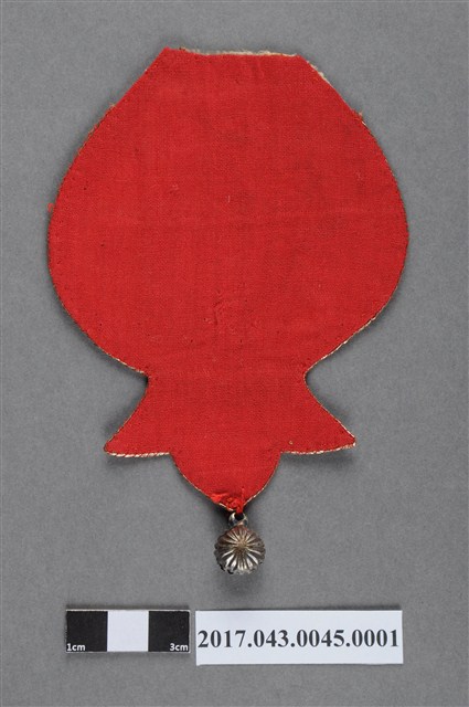 石榴形彩繡雀鳥紋飾片,呈石榴形狀,上半部呈球形,向下伸出三個銳角,代表花萼,底端縫有菊花造型的鈴鐺。正面底布為米白色及粉紅色絲緞拼組而成,兩底布間與整體繡片邊緣以綠色網格飾帶裝飾,飾帶拼接處並繡有釘金繡點綴;背面以紅色素面底布襯底。米白色底布上彩繡雀鳥飛上枝頭的圖案;粉紅色底布上則繡有魚鱗形狀,並以打籽繡繡出石榴果實籽,繡線稍為鬆脫。