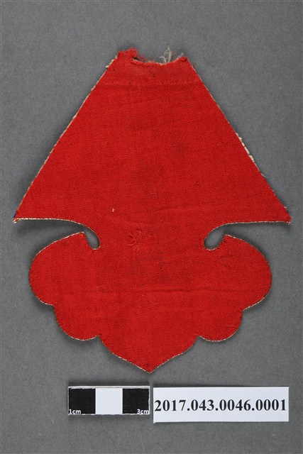 如意雲頭形蝶花紋繡片,大小約10.2 *11.7公分,上半部作梯形,下半部為如意雲頭形。正面底布為米白色絲緞,背面為紅色棉布,兩面以紅線夾金線作卷縫相接,頂端則未縫合,以接縫其他繡片。繡片正面以平針、套針、釘金、盤金、打籽等刺繡針法作彩繡裝飾,圖案以蝶花紋為主題,繡蝴蝶飛於一株花草之上。下半部的如意雲頭形邊緣以釘金繡縫合深藍色絲緞飾帶裝飾,底端並以釘金繡做卷雲紋。整體針腳細膩,配色鮮麗。