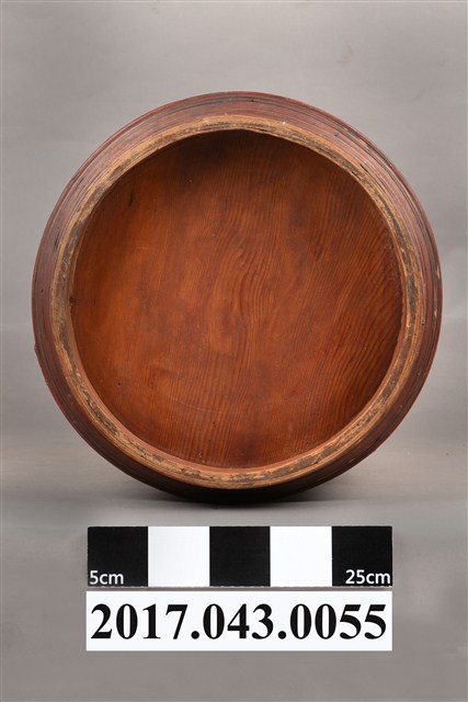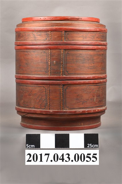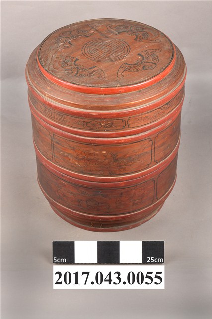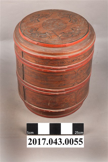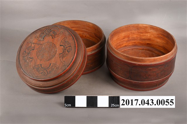 1.木製雙層圓盒,可分成盒蓋與兩層盒身三部分。盒整體呈圓筒狀,蓋與每層盒身之間皆以子母扣合。整體由木片拼組製成,盒身以木片環繞成壁,銜接處以細竹條縫製定型,每層上下兩端再以竹篾圈束固定,竹篾上並塗紅漆裝飾。盒蓋呈圓形,中央稍微凸出呈同心圓,凸出的邊緣也以竹篾圈束。盒蓋中央與外壁皆以黑漆繪圖案,為4隻蝙蝠圍繞圓形祿字變形圖案,象徵福祿之吉祥涵義;外壁繪梅花、如意、祥雲等圖案。屬於中間層的盒身呈扁圓體,外壁以黑漆繪鳳凰牡丹紋、龍紋、鹿、仕女等等。圓盒底層附圓底,底部下收,下接圈足。底層裝飾圖案則有蝴蝶花卉及瓶花、香爐等博古圖案。