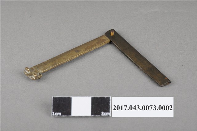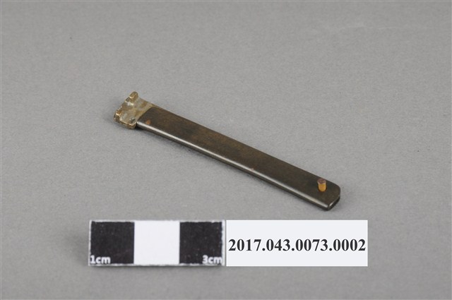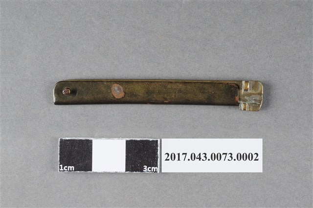 1.銅製廣鎖鑰匙,是一種中國式鎖具的構件,為開啟鎖體的工具,黃銅合金材質,具有金屬光澤。造型外觀上,鑰匙形狀為細長片狀,頂端為立體狀,上下兩面具有不對稱的點狀突起。鑰匙的尾端穿孔固定一長扁形狀的保護套,不使用時可將鑰匙收起收納於保護套中,開鎖時,也作為鑰匙長柄的延伸,方便施力與拔出鎖體。本件鑰匙為定向鎖(又稱為迷宮鎖)的鑰匙,為立體鑰匙孔的開啟工具,此類具有立體鑰匙孔的鎖具屬於複合式的開鎖設計,鑰匙插入孔時須以特定位置和方位推動或轉動,才能將鎖開啟。2.中國式鎖具相傳是在戰國時代的魯班(約西元前506年)加以改進後逐漸被廣泛使用,到了東漢末年(約3世紀),已經出現了許多不同造型的鎖具。隨著時間的推移,中國式鎖具的材質也日益豐富,至唐代(618-907)已包括青銅、黃銅、鐵、銀、金等等,在造型外觀也更加多樣化。中國式的鎖具主要分成兩種,一種為以鑰匙開啟的簧片構造鎖,另一種則是不需鑰匙開啟的文字鎖,其中又以前者為大宗,又可分為廣鎖與花旗鎖。簧片鎖的開啟方式主要是利用鑰匙進入鎖體後,擠壓彈簧片而使鎖栓和鎖體分離。相較於現代常見的鎖具,中國式鎖具在設計上更加注重鑰匙孔的設計,如將鑰匙孔隱藏於機關之下,或將鑰匙設計成不易插入鎖體上。