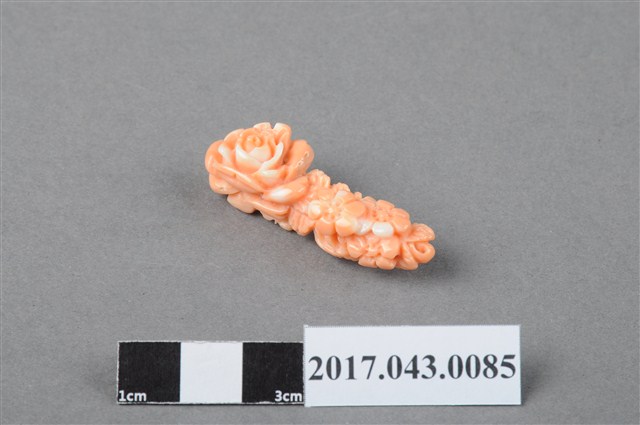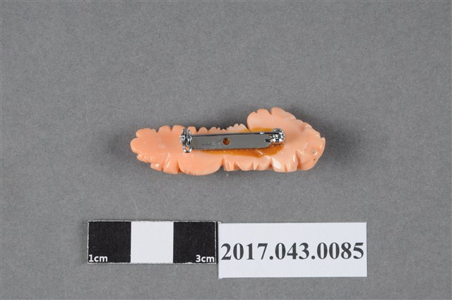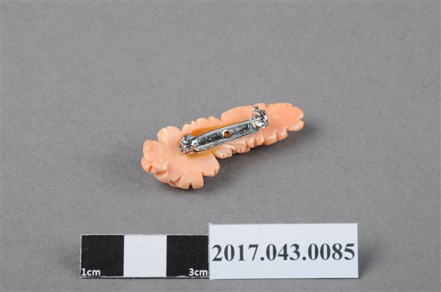 1. 珊瑚花卉別針,以珊瑚加工雕刻製作而成,珊瑚色澤呈淺粉橘色,部分邊緣帶有白色,整體具有臘狀之溫潤光澤。雕刻裝飾題材主要作朵花紋,花朵以橫式排列,最大的花朵居首,作含苞層層綻放之貌,接著周圍雕刻葉形紋與六瓣小朵花卉,些許葉子與六瓣花卉延伸至側邊,增加整體造型的立體感。別針背面平整無雕飾,中央以膠黏合銀色金屬針座,有些許溢膠痕跡。2. 珊瑚在人類社會文化中被視為珍貴的有機寶石,被用以加工製作成擺飾或隨身佩帶的飾品。日治時期,日人發現宜蘭南方澳地區豐富的寶石珊瑚資源,開始了臺灣的珊瑚漁業。從南方澳開採的珊瑚品質優良,質地細緻,且色階豐富完整,在開採之初便受到時人的喜愛,產量一度高居全球之冠。珊瑚工藝品除了擷取其自然的生長姿態之外,有的也用於雕刻,常見的題材有神道仙佛、山水風景、花鳥瑞獸等。