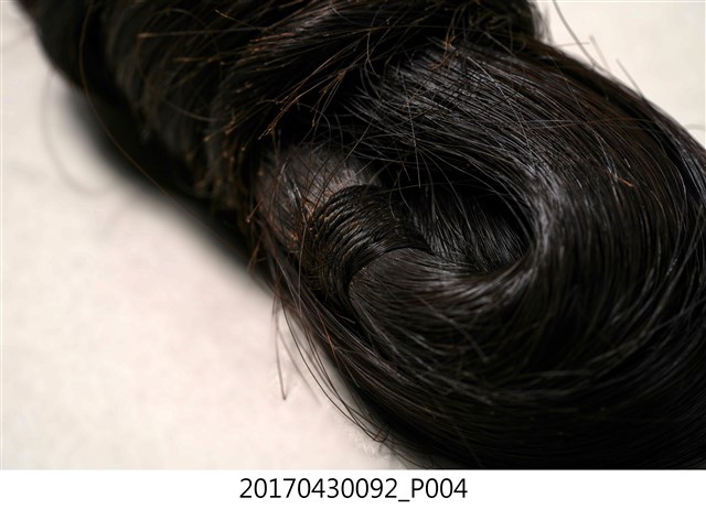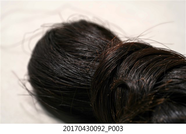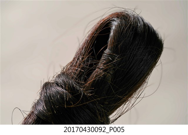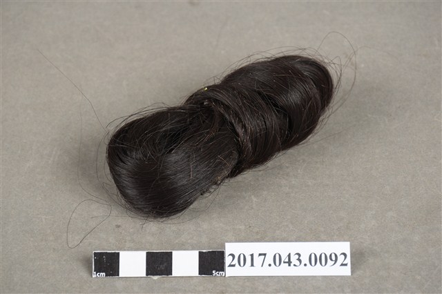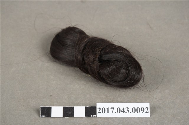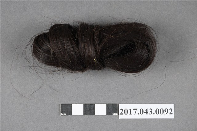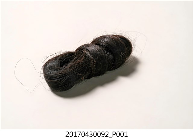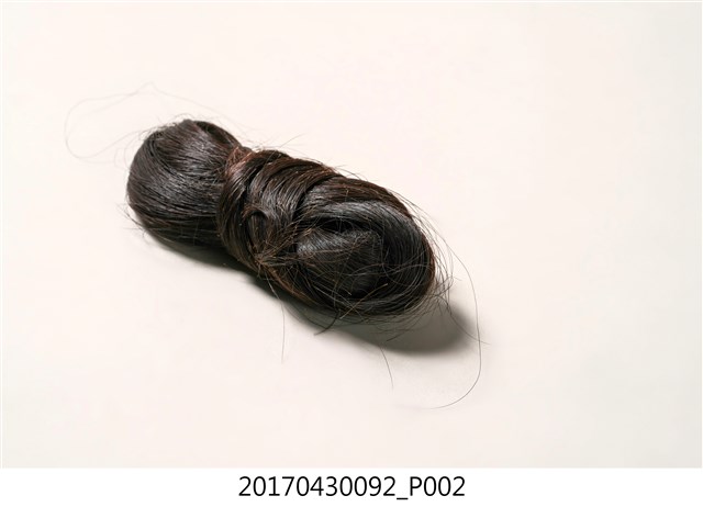 1. 本件為張捷髮結,大小約10公分,是畫家陳澄波妻子張捷女士過去因欲舉家遷移上海而削剪的頭髮。髮結為真髮,是由一束烏黑濃密的長髮纏繞盤結紮成。頭髮以約10公分為一單位,彎折交錯捲繞成3至4段成為一束後,剩下的髮絲於髮束中間纏繞2至3圈捆緊固定,部分髮絲在捲繞時散出,散佈於整個髮結外圍。2. 據張捷之子陳重光先生的口述,1929年,張捷丈夫陳澄波先生在東京美術學校研究科學成,經由中國畫家王濟遠的介紹,獲聘至上海新華藝專與昌明藝專任教,因此全家搬遷至上海生活。此藏品為母親張捷於1929年要搬遷到上海前剪下的頭髮,祈求出此遠門能夠平安歸來。3. 頭髮在傳統民俗觀中是象徵人的生命力之所在,被剪下而與人體分離的頭髮,也被視為能夠影響原主命運的象徵物,甚至是自身的替代品。古人不輕易剪去頭髮,而是在生命重要的場合或儀式中才透過剪髮象徵新的身份,或以剪去的頭髮作為祭品,象徵犧牲自己讓祈禱之事能夠實現。