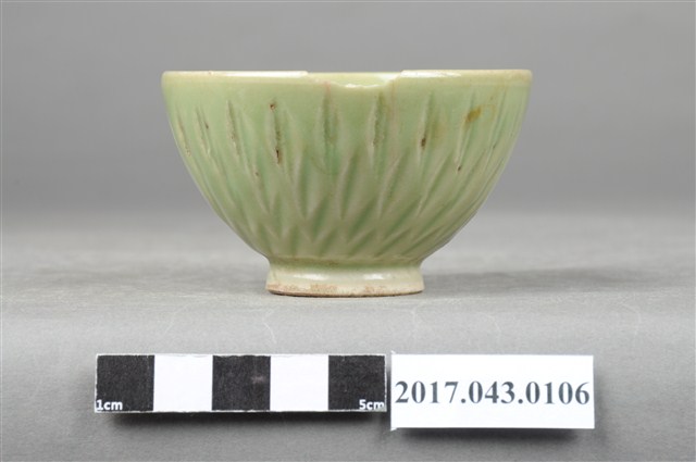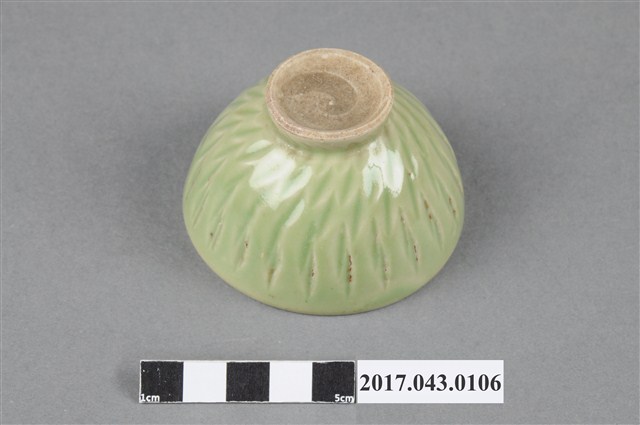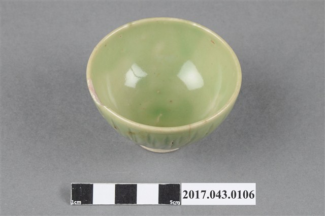 綠釉小圓杯以模具成形,高溫燒製,以覆鏇壓法製作,圓唇,平敞口,弧壁,深圓腹,杯底較窄,小圈足,足徑小於口徑的一半,圈足略高,圈足露胎,胎色白中帶黃,胎質細膩。圈足底有一旋渦狀紋路。全器施綠釉,呈色淺薄透亮,杯底與外壁紋飾凹陷處有積釉現象,釉色較深。全器器表多有氣孔與少許雜質;圈足壁與口沿有縮釉現象,部分釉面有變色的狀況。口沿一處破損,且內壁有一明顯裂痕;且內壁釉色發色不均。小杯外壁素面無紋,僅以模具印出短短的紋路,結組成長條狀,且紋路近圈足處做扭轉,使整體線條有旋轉下收般的視覺效果。全器除外壁模印長條紋路外,皆別無他飾,以釉色表現為主,整體簡潔素雅。