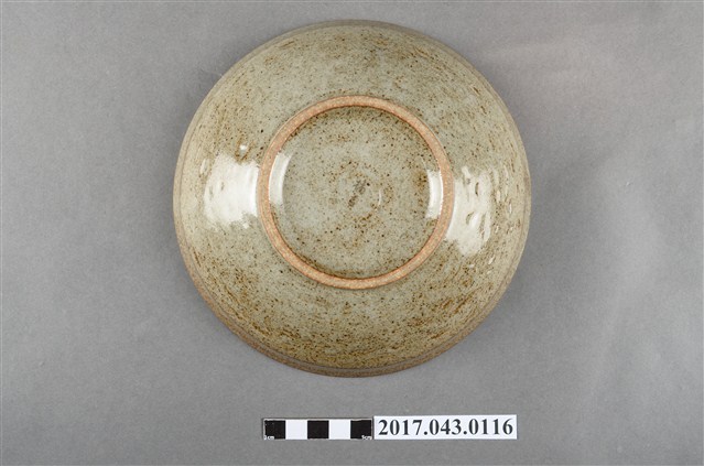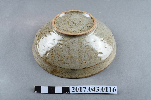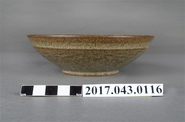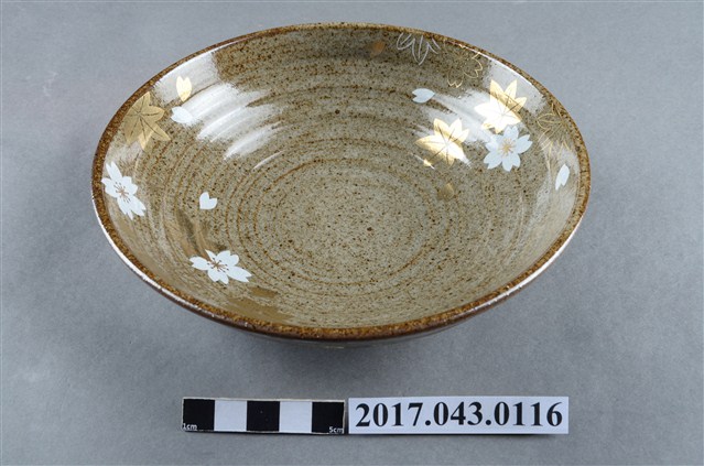 本件橘吉灰釉褐斑金彩白櫻楓葉紋圓盤,直徑約16.5公分,高約5公分,原為陳澄波先生收藏品(陳澄波基金會原始編號RE120_01),由其長子陳重光先生捐贈給臺灣歷史博物館。以模製成形,廣口,口沿下方作一折痕,折痕以下斜收至底部,底有圈足。盤內壁壓模裝飾環狀弦紋,碗外壁壓模裝飾切削紋,除圈足底外全器施釉,釉色呈灰底帶褐色斑點,口沿、外壁折痕處與內壁弦紋褐斑較為密集。盤內緣兩側印刷裝飾金色和白色櫻花和楓葉紋飾,盤底心壓模一小圓圈,中央印有金色「橘吉」商標字樣。2.橘吉為日本的日式餐具品牌,前身「立吉屋吉兵衛」創立於1752年江戶時代的京都地區,1894年,由第8代所有者岡田德之介更名為「たち吉」,自古以來傳承日本的傳統與文化,在日本各地知名的陶瓷產地生產創作陶瓷器。