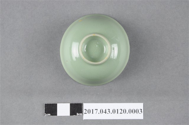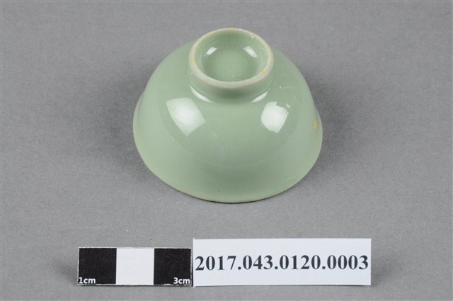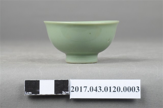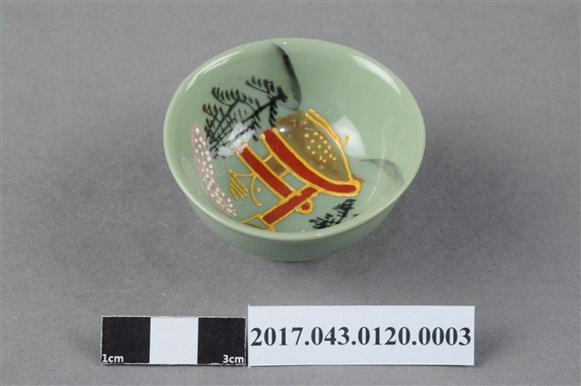 彩繪綠釉小酒杯以模具成形,高溫燒製,圓唇,微侈口,口沿略不平整,寬圓腹,杯底較寬,弧壁平收至圈足,小圈足,足徑小於口徑的一半,圈足略高,圈足刮釉露胎,胎色白中略帶黃,胎質細膩。全器施罩綠釉,呈色均勻透亮,光澤瑩潤。全器製作精良,釉面光滑,僅有少數氣孔。小酒杯外壁素面無紋,主要紋飾繪於杯內壁,為仿九古燒的描金上繪與金粒手法。紋飾色彩豐富,以一筆墨描繪遠山山景,墨色由深至淺;紋飾主體為一日本神社的鳥居建築,先以黃色釉勾勒輪廓,再以紅色釉、淺棕色填彩。黃色釉料濃稠。神社旁繪樹木,遮住部分神社。兩側亦以淡粉紅色釉、白色釉繪成花圃。杯底泥印「歧173」是岐阜縣窯口的「生產者別表示記號」,即窯場標號,表示是1938以後的製品。