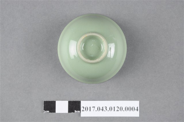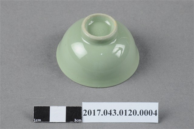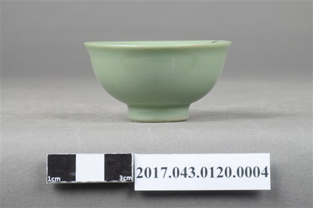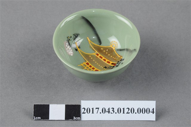 彩繪綠釉小酒杯以模具成形,高溫燒製,圓唇,微侈口,口沿略不平整,寬圓腹,杯底較寬,弧壁平收至圈足,小圈足,足徑小於口徑的一半,圈足略高,圈足刮釉露胎,胎色白中略帶黃,胎質細膩。全器施罩綠釉,呈色均勻透亮,光澤瑩潤。全器製作精良,釉面光滑,僅有少數氣孔。小酒杯外壁素面無紋,主要紋飾繪於杯內壁,為仿九古燒的描金上繪與金粒手法。紋飾色彩豐富,以一筆墨描繪遠山山景,墨色由深至淺;紋飾主體為一雙層傳統建築,先以黃色釉勾勒輪廓,再以紅色釉、淺棕色填彩。黃色釉料濃稠。建築樣式為重檐歇山式房屋,多出現於等級較高或是官署所用的建築。建築旁繪樹木,遮住部分結構。兩側亦以淡粉紅色釉、白色釉繪成花圃。杯底泥印「歧173」是岐阜縣窯口的「生產者別表示記號」,即窯場標號,表示是1938以後的製品。